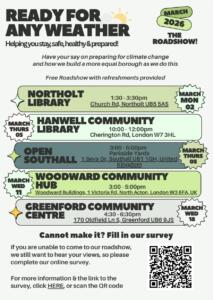 We’re hosting a series of friendly, drop‑in community conversations across the borough. These workshops are a chance to share what you’re seeing locally, learn about climate impacts, and help shape solutions that work for your neighbourhood.