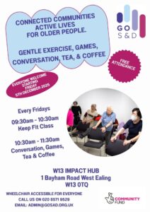 Our project brings older people together to stay active, connected, and supported. We run gentle exercise sessions, games, conversation, and social activities every Friday morning at the W13 Impact Hub in West Ealing. The Keep Fit class runs from 9:30am to 10:30am, followed by an hour of conversation, games, tea, and coffee.